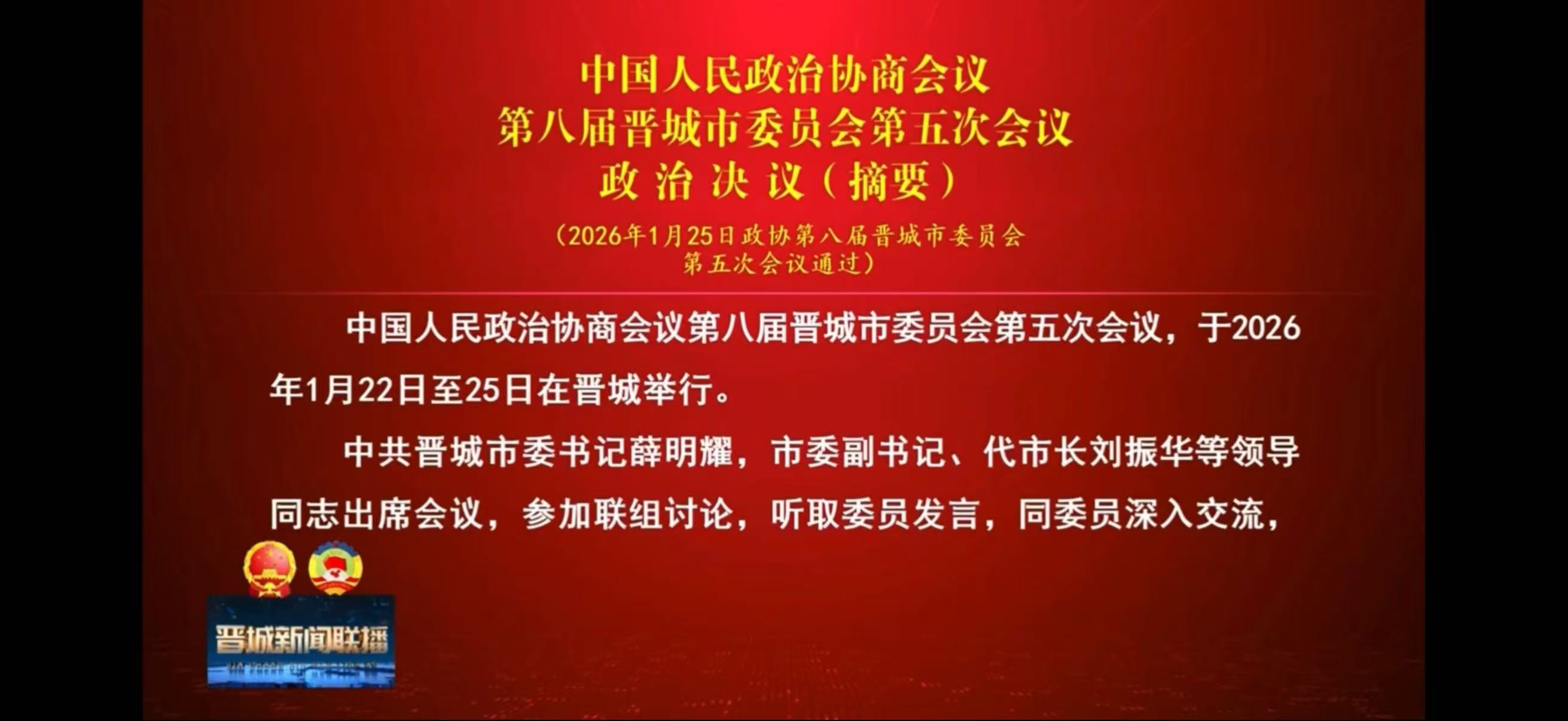 中国人民政治协商会议第八届晋城市委员会第五次会议今日开幕